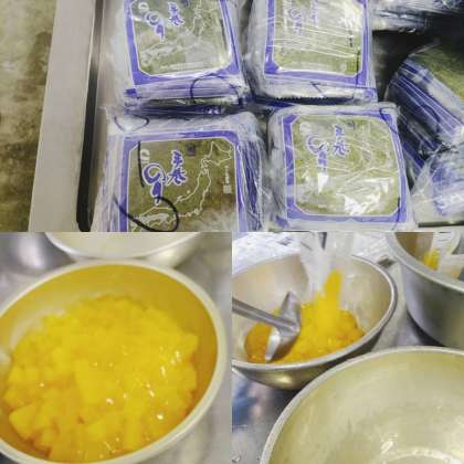 「手巻きご飯」は、牛肉のコチジャンいためとさけのカラフルそぼろを、手巻き焼きのり で ご飯と一緒に巻いて食べます。牛肉のコチジャンいためは、牛肉、にんじん、切干しだいこんをにんにくの風味をいかしていため、砂糖、こいくちしょうゆ、コチジャンを合わせた調味液で味つけします。最後に青みににらを加えていため、彩りよく仕上げています。さけのカラフルそぼろは、紅ざけ(フレーク)、むきえだまめ、コーンを混ぜ合わせて、砂糖、塩、ワインビネガー、うすくちしょうゆで下味をつけ、焼き物機で焼きます。手巻き焼きのりは、 これまで4枚入りが1人2袋ずつついていましたが、今回から6枚入りが1人1袋ずつつきます。