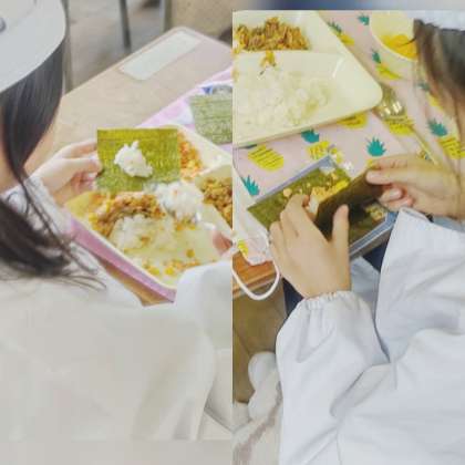 1年生は初めての献立です。一生懸命海苔にご飯と具をのせて食べています。