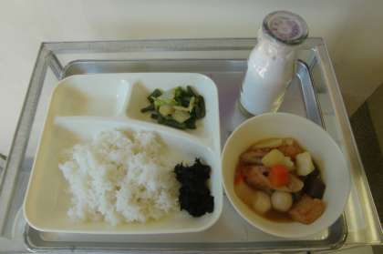 関東煮・三度豆のからしあえ・のりのつくだ煮・ご飯・牛乳