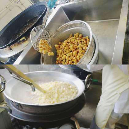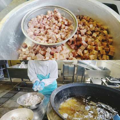 「まぐろのオーロラ煮」は、児童生徒に人気の献立です。しょうが汁、料理酒で下味をつけたまぐろにでん粉をまぶし、油であげ、ケチャップ、砂糖、赤みそで作ったタレをからめています。中学校は、まぐろを小学校の1.5倍にしています。