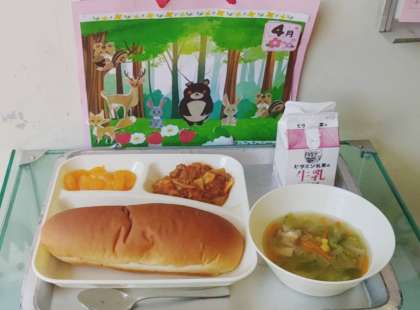「レタスのスープ」は、4月、5月に月1回使用できるレタスの他に、鶏肉、にんじん、コーンを使用し、パセリで彩りよくしています。
