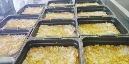 「じゃがいものミートグラタ ン」は、牛ひき肉、豚ひき肉 を主材にしたグラタンです。じゃがいもに上新粉を使用したケチャップ味のミートソー スを合わせています。パン粉も米粉 のものを使用しています。