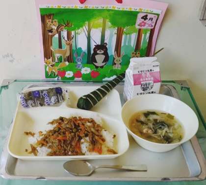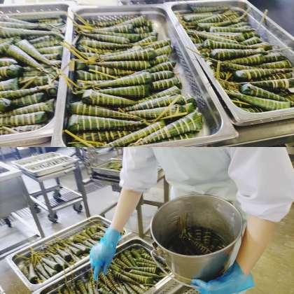 「ちまき」は、うるち米の粉などで作った餅を笹の葉で包み、い草で巻いて作られています。大阪市の学校給食のちまきは、原材料は全て国産で、市販されているものと比べ、糖分を控えた大阪市独自のものです。児童生徒の成長を願い、こどもの日の行事献立として毎年登場しています。穴あきホテルパンにならべ、焼き物機で蒸しています。