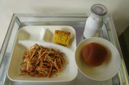 きのこのスパゲッティ・焼きとうもろこし・黒糖1/2パン・牛乳