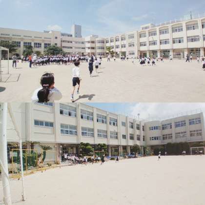 校内放送の合図で、避難開始です。運動場に避難しました。避難時間は4分34秒でした。とても静かに迅速に避難訓練をしました。
