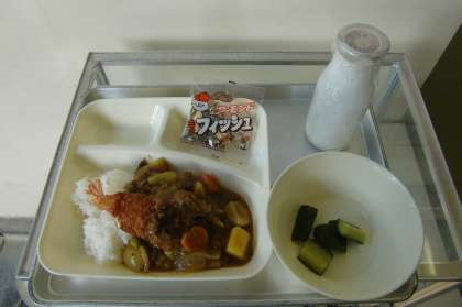 えびフライカレーライス・きゅうりのピクルス・アーモンドフィッシュ・ごはん・牛乳