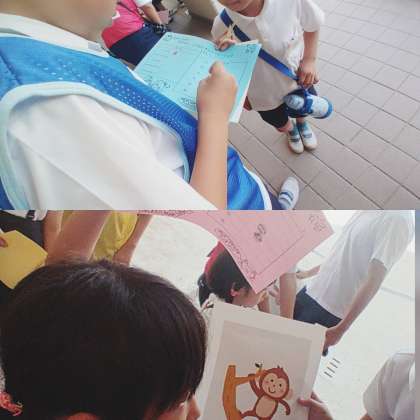 5つのゲームを6年生と一緒に探してゲームをしました。6年生は、1年生に合わせて歩いたり回る順番を考えたりしていました。