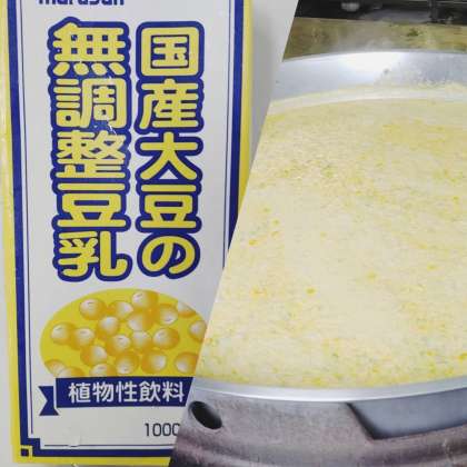 「豆乳スープ」は、ベーコンで旨みを増し、じゃがいも、たまねぎ、コーン、にんじん、む きえだまめを使用した、豆乳のまろやかさを生かしたスープです。