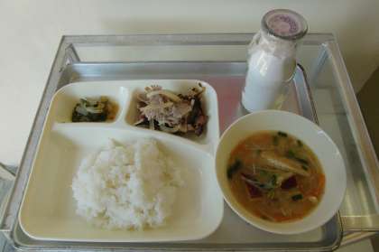 豚肉のしょうが焼き・さつまいものみそ汁・きくなとはくさいのごまあえ・ご飯・牛乳です。