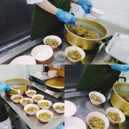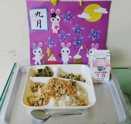 「他人丼(どんぶり)」は、牛肉とたまねぎなどの野菜を甘辛く煮て、彩りに青ねぎを加え、卵でとじた具をごはんにかけます。この献立は、【 卵 】の除去食です。