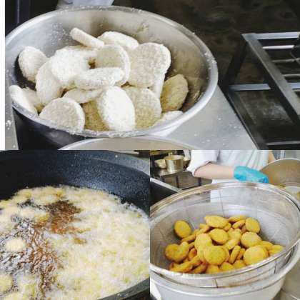 「チキンレバーカツ」は、ほんのりカレーの味がついて食べやすく、不足しがちな鉄をとることができる一品です。170度の油であげています。小学校は50g、中学校は60gとなっています。