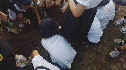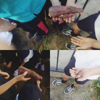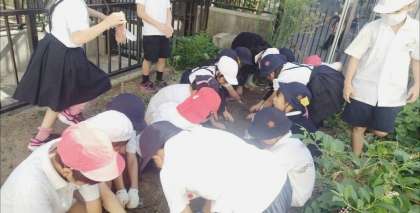 2年生が学習園でお芋掘りをしました。水をあげたり草を抜いたり一生懸命に育てました。大きい芋や小さな芋が掘れました。たくさんの芋が収穫できました。