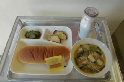 みそラーメン・きゅうりの辛みづけ・焼きさつまいもの甘みつかけ・大型コッペパン・牛乳です。