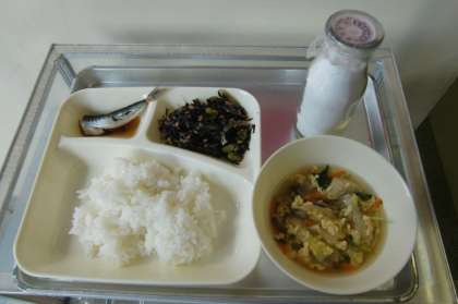いわしのしょうが煮・かきたま汁・ひじきのそぼろ煮・ご飯・牛乳