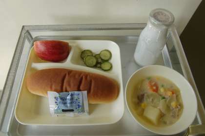 コーンクリームシチュー・きゅうりのサラダ・りんご・コッペパン・牛乳