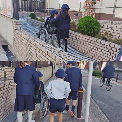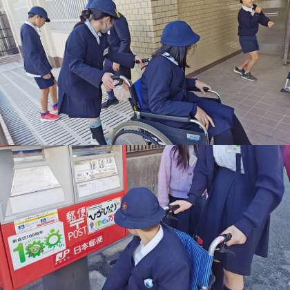実際に車椅子に乗って学校の周りを押して歩きました。乗る人と実際に車椅子を押す人と誘導係で体験をしました。車椅子に乗ることの大変さや難しさを知りました。横でサポートしてくれている人のありがたみが分かりました。