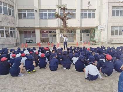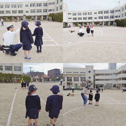 1・2年生は交差点の渡り方を実際に運動場でしました。信号が青になったら、安全確認をして渡ります。