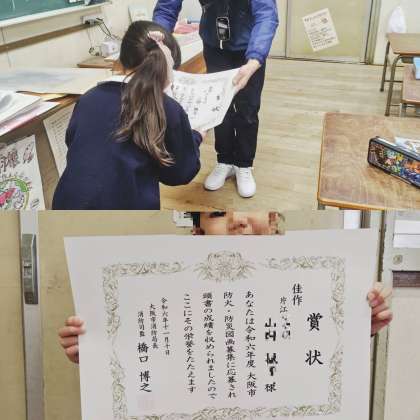 表彰されました。大阪市消防局主催「大阪市防火・防災図画」の募集で佳作の成績をおさめました。