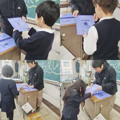 担任の先生から1人1人通知票が渡されました。頑張った所やこれから頑張ることを聞きました。2学期頑張った事が通知票に詰まっています。