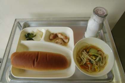 鶏肉のオイスターソース焼き・ラーメン・ピリ辛あえ・黒糖パン・牛乳