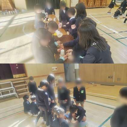 2年生の手作りで作った車やペットボトルで紙コップを飛ばしました。聖美幼稚園の園児も楽しいそうに遊んでいました。交流会でみんな仲良くなりました。