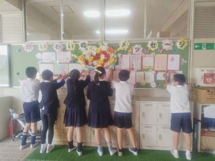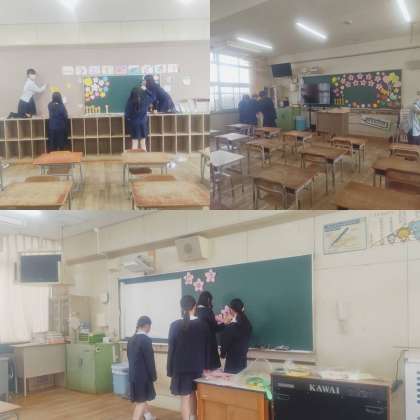 新6年生が会場の設営やトイレ掃除、1年生の教室の飾り付けをしました。