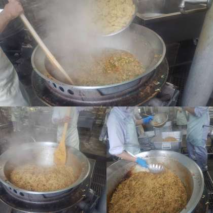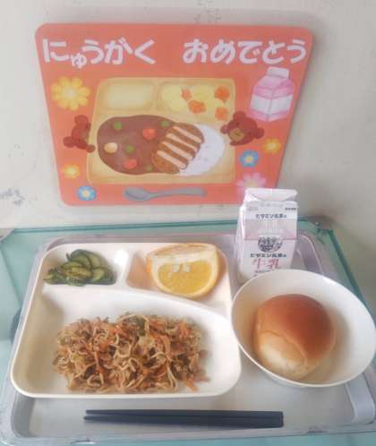 豚肉を主材にしたソース味の「焼きそば」は、児童生徒に人気の献立です。中学校は、小学校の1.4倍にしています。