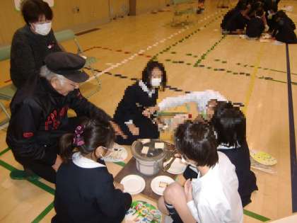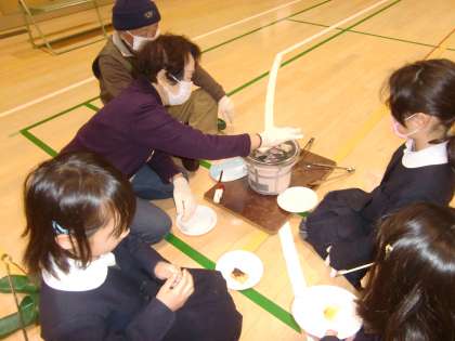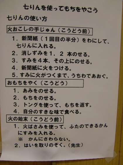 大雨の中でしたが、地域の方にお手伝いいただいて、七輪を使って火起こしをしました。新聞紙に火をつけ、その火が炭にしっかりと移るまで、うちわであおぎます。そして火が起こると、次はお餅を焼きます。焼けてくると香ばしい香りがあたりに漂います。七輪で焼くと、中はとってもふんわりと焼き上がりました。焼けたお餅を、子どもたちは美味しそうにほおばっていました。