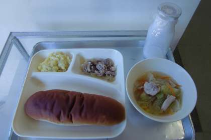 豚肉と野菜のソテー・スープ・スイートポテト・黒糖パン・牛乳