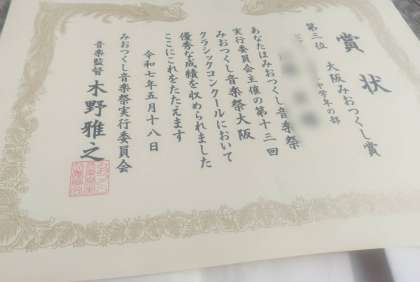 みおつくし音楽祭実行委員会主催の「第13回みおつくし音楽祭大阪クラシックコンクール」において第3位の成績を収めました。