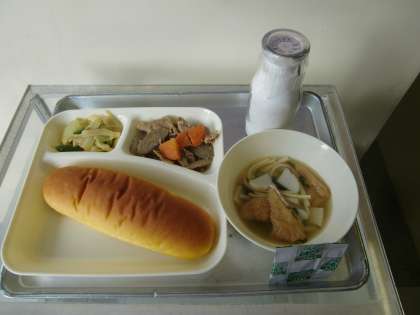 豚肉とごぼうの煮もの・なにわうどん・キャベツと三度豆のごまあえ・パンプキンパン・牛乳です。