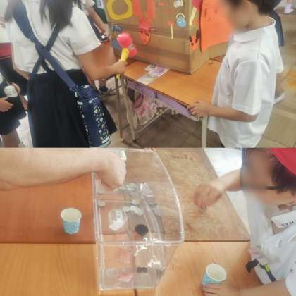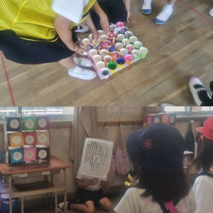 天使と悪魔のチャレンジ・なぞなぞボックス・的あて・爆弾を探す・王様じゃんけん・紙コップの神隠しなどを各クラスでお店を開きました。