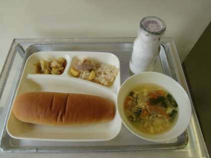 中華おこわ・卵スープ・キャベツのオイスターソースいため・黒糖パン・牛乳です。