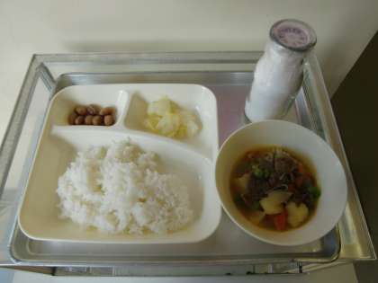 肉じゃが・はくさいの甘酢づけ・とら豆の煮もの・ご飯・牛乳です。