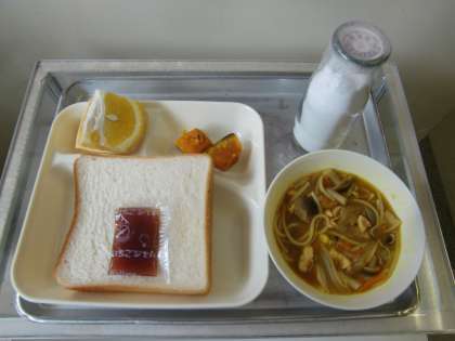 カレースープスパゲッティ・かぼちゃのバター焼き・甘夏かん・食パン・牛乳です。