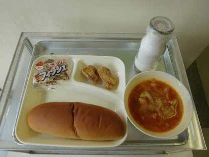 一口トンカツ・ミネストローネ・アーモンドフィッシュ・黒糖パン・牛乳です。