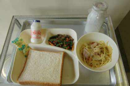 牛肉と三度豆のソテー・トマトのスープスパゲッティ・はっ酵乳・食パン・牛乳