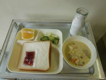 コーンクリームシチュー・グリーンサラダ・河内ばんかん・食パン・牛乳です。