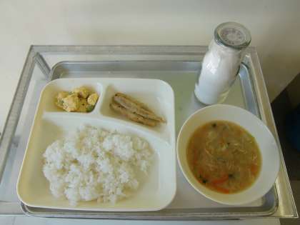 きびなごてんぷら・みそ汁・えんどうの卵とじ・ご飯・牛乳です。
