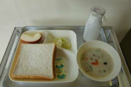 きのこクリームシチュー・キャベツのピクルス・りんご・食パン・牛乳