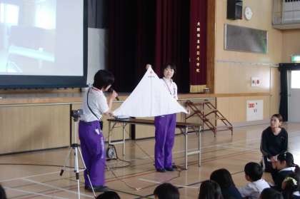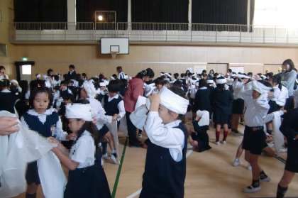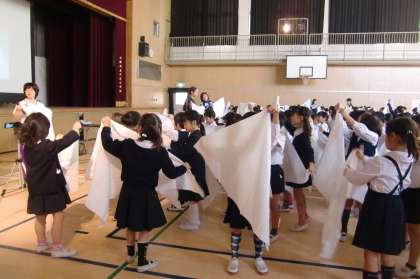 「ケガをした時の手当の方法」として三角巾を実際に使用して使い方を教えていただきました。止血・包帯といろいろな使用方法があります。子どもたちも自分たちで、包帯を作り頭に巻いてみました。大きな三角巾に苦戦している子どももいましたが、一所懸命に頑張っていました。