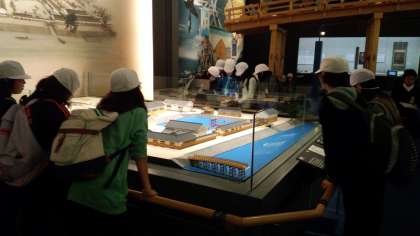 大阪歴史博物館では、大阪の古い街並みや、道具などの展示物を興味深く見学していました。