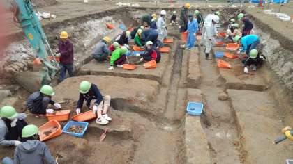 お弁当を食べた後、発掘体験です。古い時代から土の中に眠っている瓦等を発掘し、子どもたちは大喜びです。