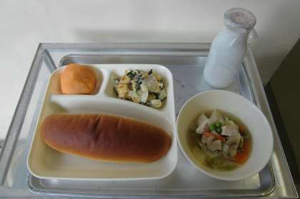鶏肉とキャベツのスープ煮・ほうれん草のグラタン・かき(富有柿)・黒糖パン・牛乳