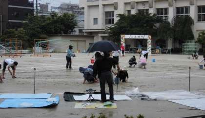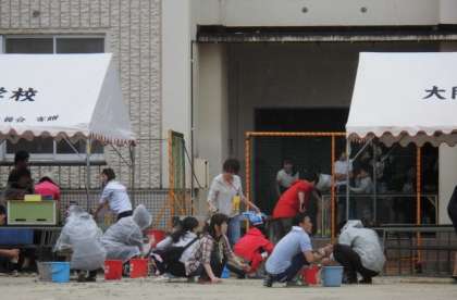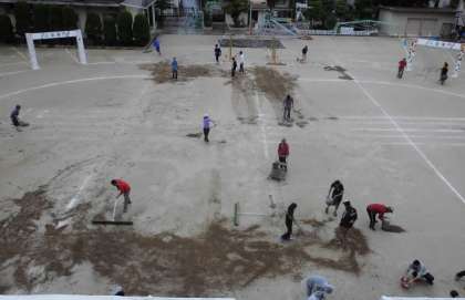 そこで、PTA保護者と教職員が一丸となって、水を抜き取り、土を入れグランド整備を行いました。