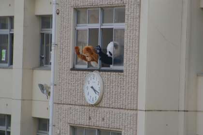 かっくんとたえちゃんが、校舎の3階から運動会を観戦していました。