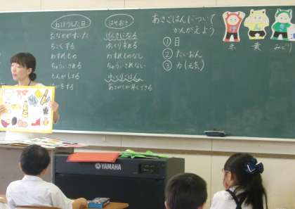 「あさごはんについてかんがえよう」というテーマで、2年生に栄養学習を行いました。
