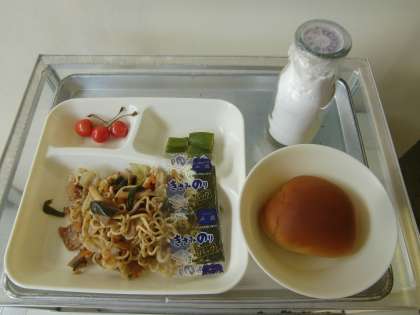 焼きそば・オクラの中華あえ・さくらんぼ・黒糖1/2パン・牛乳です。