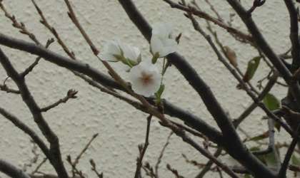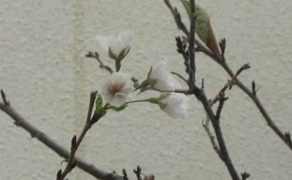 本日、片江小学校給食室近くの桜の木に、なんと花が咲いていました!