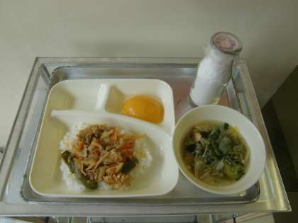 ピリ辛丼・中華スープ・黄桃(缶)・牛乳